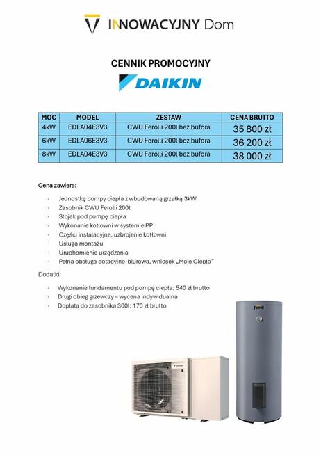 POMPA CIEPŁA DAIKIN EDLA ZASOBNIK CWU 200L FEROLLI - MONTAŻ CENY BRUTTO 4kW MODEL EDLA04E3V3 CWU Ferolli 200l bez ...