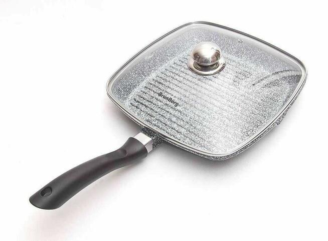 Patelnia marmurkowa szara typu grill. Rozmiar 28x28cm, dno od zewnątrz stalowe. Pokrywa szklana. Na kuchenki gazowe, ...