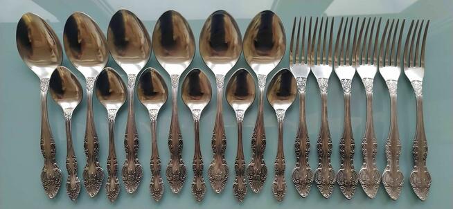 Zestaw sztućców obiadowych ze stali nierdzewnej wyprodukowanych w ZSRR. Nieużywane. Bez pudełka. Sześć łyżek dużych, ...